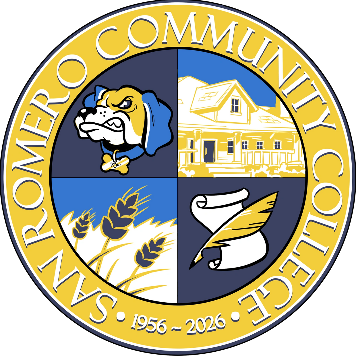 The Great Seal of San Romero Community College tells the story of our school, starting with the upper corner and moving clockwise: the English building (the oldest one on campus}; quill and parchement showing our committment to learning; the wheat fields of the former MacGregor farm on which our school sits and finishing with the Hound Dog, our mascot since 1956. To celebrate the 70th anniversary, we've commissioned a variant which we will be using during the celbreation.